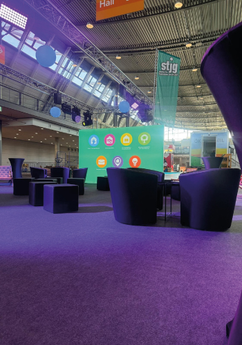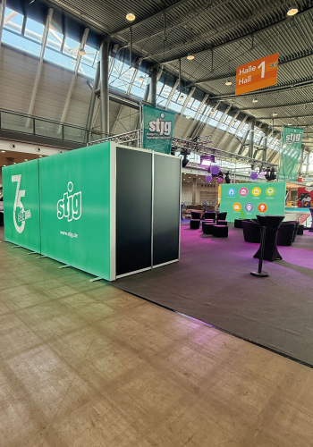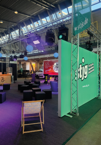 Beim Messeherbst in Stuttgart haben wir erneut das ProjektWerk der StjG (Stuttgarter Jugendhaus Gesellschaft) bei der Umsetzung des Messestandes umfassend unterstützt. Unser Leistungsspektrum umfasste hochwertige Mietmaterialen, darunter R8 Systemwände, die zu einer kleinen Kabineneinheit für Lager und Catering aufgebaut wurden, Leuchtrahmen mit eingefassten Motivbannern, Traversen, LED-Beleuchtung sowie Lounge-Möbel wie Sofas, Tische und Sitzhocker. Eine dekorative Holztheke mit Frontlogo rundete den zentralen Bereich der Standfläche ab.